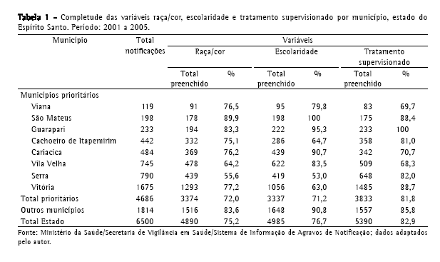 Objetivo: analisar a completude dos dados do Programa de Controle da Tuberculose no Sistema de Informação de Agravos de Notificação do Estado do Espírito Santo no período de 2001 a 2005. Métodos: estudo descritivo de análise de dados secundários. As variáveis estudadas foram: raça/cor, escolaridade, tratamento supervisionado, encerramento de cultura de escarro, situação de HIV, baciloscopia de 6º mês e situação de encerramento. Resultados: Utilizando-se os parâmetros técnicos do Sistema de Informação de Agravos de Notificação do Ministério da Saúde que dizem respeito ao percentual de preenchimento dos campos das fichas de notificação, o banco de dados sobre tuberculose no estado do Espírito Santo pode ser considerado de regular a excelente. Há no estado do Espírito Santo 78 municípios, dos quais 8 são prioritários no controle da tuberculose. Os municípios não prioritários apresentaram maior completude do que os prioritários em relação às variáveis estudadas, exceto na situação de encerramento, com percentual idêntico de preenchimento. Conclusões: Os municípios prioritários são responsáveis por 70,2% do total de notificações, devendo, portanto, melhorar a qualidade dos registros em relação ao preenchimento dos campos e à atualização dos dados, primordiais para a confiabilidade da análise epidemiológica. Isto possibilitará o planejamento de ações de prevenção e controle da tuberculose no estado.