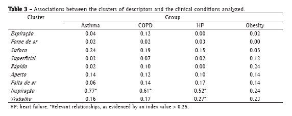 When the translated descriptors were used, the inspiração cluster was the only cluster that was significantly associated with asthma and COPD. In contrast, heart failure was shown to be associated with the inspiração and trabalho clusters, whereas obesity was not significantly associated with any of the clusters. These results are in disagreement with those of other studies, in which each clinical condition was associated with a unique collection of clusters.(5,8,14) However, an analysis of the composition of the collections of clusters across studies shows that the associations between clusters and specific clinical conditions do not follow a homogeneous pattern. In addition, various studies have noted only the frequencies of the descriptors chosen and of the clusters formed, no mathematical attempts having been made to characterize, in a more precise manner, the role of the clusters obtained in the differential diagnosis of the conditions under study.(7,11,12) Nevertheless, our findings provide evidence that the interpretation of the patterns of clusters of dyspnea descriptors does not play an important role in the differential diagnosis of clinical conditions.