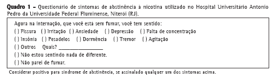 Quando o paciente era fumante, respondia informações adicionais sobre o hábito tabágico: quantidade de consumo de cigarros; idade de início e tempo de tabagismo; interesse em abandonar o tabagismo; número de tentativas prévias para parar de fumar; necessidade de ajuda para abandonar o hábito; grau de dependência de nicotina; presença de sintomas respiratórios, tais como dispneia, tosse seca ou produtiva e chiado no peito; questionário de sintomas de abstinência à nicotina utilizado no ambulatório de tabagismo do HUAP (Quadro 1); história familiar de tabagismo; e utilização de bebidas alcoólicas.