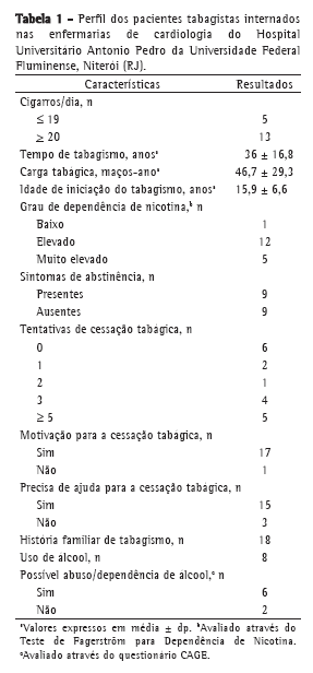 Dos 18 fumantes, 10 (55,5%) eram do sexo masculino e 8 (44,4%) eram do sexo feminino. Com relação ao grau de dependência de nicotina, 17 desses pacientes apresentaram grau de dependência elevado ou muito elevado. A média de cigarros fumados foi de 24,7 ± 11,2 cigarros/dia, o tempo médio de tabagismo foi de 36,0 ± 16,8 anos, sendo a carga tabágica média de 46,7 ± 29,3 maços-ano. A média de idade de iniciação ao tabagismo foi de 15,9 ± 6,6 anos (variação: 6-32 anos). Quanto ao número de tentativas prévias para parar de fumar, 6 pacientes nunca o haviam tentado, e 12 tinham tentado pelo menos uma vez (Tabela 1).