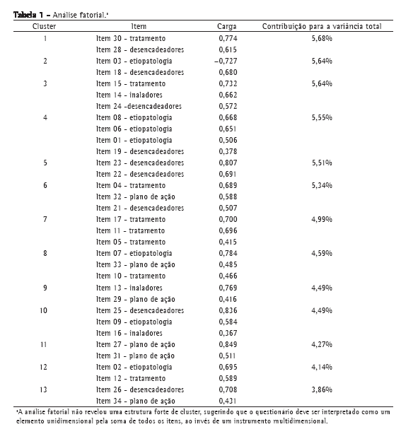 Houve algumas limitações neste estudo. Embora o questionário tenha sido adequado para a análise fatorial, tivemos uma razão de apenas 3,94 respondentes para cada questão, e o questionário não apresentou uma estrutura forte de cluster. Quando os itens foram analisados separadamente, 13 questões poderiam diferenciar significativamente os pacientes asmáticos dos controles, 5 questões mostraram uma tendência à significância, e 16 não alcançaram diferenças estatisticamente significativas entre os pacientes asmáticos e os controles. Portanto, o questionário deveria ser interpretado com a soma de todos os itens ao invés de itens isolados ou ­clusters de questões.