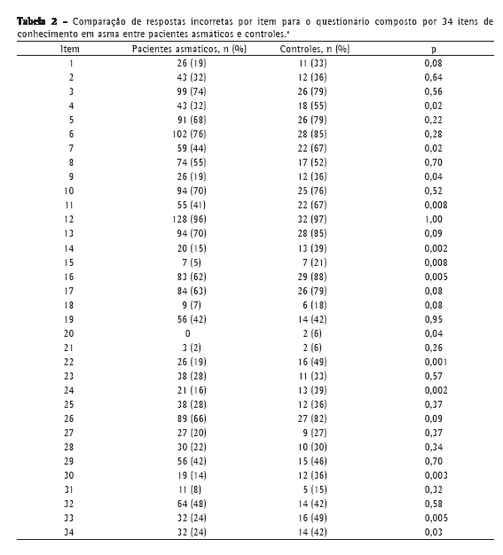 Pela comparação dos escores totais e dos itens individuais, também demonstramos que o questionário distinguiu claramente entre pacientes asmáticos e controles, tendo estabilidade temporal e consistência interna aceitável. Os pacientes asmáticos responderam corretamente apenas 63% das questões. As questões respondidas incorretamente, para a maioria dos pacientes asmáticos, foram principalmente aquelas sobre o tratamento da asma. Além disso, 96% dos pacientes asmáticos consideraram os broncodilatadores como o melhor medicamento para controlar a asma; 63% acreditavam que corticosteroides inalatórios não deveriam ser utilizados para a asma; e 70% achavam que poderiam se viciar em medicamentos inalatórios. Esses assuntos deveriam ser considerados em consultas médicas e em programas de educação.
