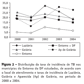 A incidência de TB no estado de Goiás variou, no período estudado, de 15,70 a 18,70/100.000 habitantes. A média de incidência dos municípios estudados, ao se acrescentar os casos atendidos no DF, aproximou-se dos valores estaduais e os ultrapassou em 2000 e 2002. O estado de Goiás apresentou taxa de incidência de 18,5 e 18,6/100.000 habitantes e a dos municípios de 19,7 e 20,6/100.000 habitantes, respectivamente, em 2000 e 2002.