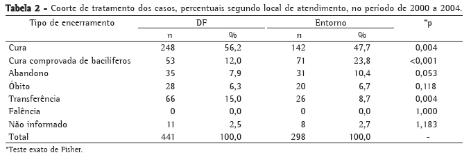 Na Tabela 2 estão relacionados os dados referentes à coorte de tratamento dos casos atendidos no DF e nos municípios estudados. No DF, 68,2% dos casos dos municípios estudados tiveram tratamento encerrado devido à cura (calculada sobre total de casos incluindo-se outros tipos de encerramento: abandono, transferência, óbito e sem informação) sendo que, destes, 12% foram caracterizados como cura comprovada de bacilíferos. Dos casos atendidos na região do Entorno, 71,5% foram encerrados por cura, sendo 23,8% por cura comprovada de bacilíferos. A taxa de cura foi significantemente maior no DF (p = 0,004), o contrário se observa em relação à cura comprovada de bacilíferos. Constataram-se, tanto no DF quanto nos municípios estudados, taxas de cura abaixo do percentual de 85%, preconizada pelo MS; mesmo quando se soma o percentual de cura comprovada de bacilíferos obtém-se, considerando-se o DF e municípios estudados, um percentual médio de cura dos casos de 69,9%. Observaram-se no período taxas de abandono acima dos 5% aceitáveis, segundo o MS; o DF apresentando 7,9% e os municípios estudados 10,4%, sendo a diferença estatisticamente não significativa (p = 0,053).