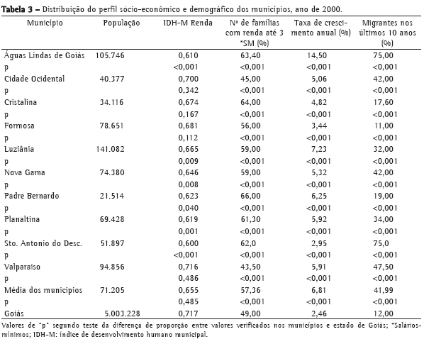 Os dados demográficos dos municípios estudados, relativos ao ano censitário de 2000 (Tabela 3), demonstram taxa geométrica de crescimento populacional de 6,14%, enquanto no estado de Goiás esta taxa foi de 2,46%. Em todos os municípios estudados, o crescimento populacional anual foi maior que o do estado, com diferença estatisticamente significativa quando comparados (p < 0,001). O percentual de migrantes de outros estados para os municípios estudados foi, nos últimos 10 anos, de 35,2% em média, sendo o percentual para todo o estado de 12%; as taxas mostraram migração maior que a do estado, exceto para o município de Formosa, com diferença estatisticamente significativa para todos municípios ( p < 0,001).
