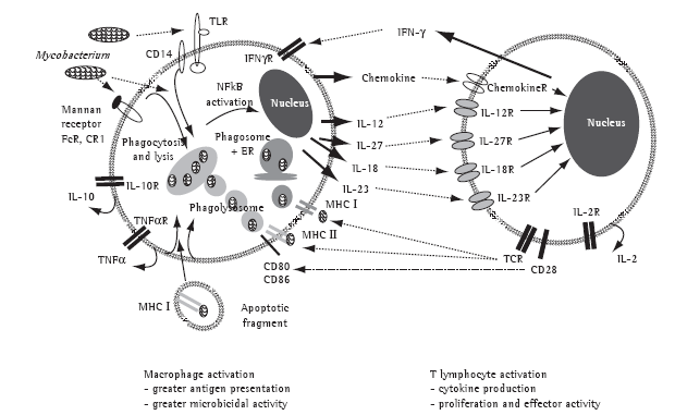 Cytokines, molecules produced and secreted by different immunocompetent cells after some stimulus, are a central component in the defense against mycobacteria. At all stages of the immune response, the cytokines produced participate in the regulatory processes, as well as in effector functions.(3) The recognition of the mycobacteria and posterior secretion of IL-12 by macrophages are processes initiated before the M. tuberculosis antigens are presented to T lymphocytes (Figure 1). The production of interferon-gamma (IFN-.) in NK cells is induced by IL-12 in the initial phase of the immune response. In addition, IL-12 induces the activation, differentiation, and production of IFN-., as well as the expansion of antigen-specific Th1 cells. Recently, other cytokines have been described, produced by macrophages and dendritic cells, which present similar activity to that of IL-12.(15) The production of IFN-. is also induced by IL-23, IL-18, and IL-27, a process that is accelerated when IL-18 and IL-27 act in synergy with IL-12 (Figure 1). It is believed that IL-27 acts in an early phase of the immune response, preceding IL-12 in the inducement of the production of IFN-., whereas IL-12 presents strong activity in the amplification of IFN-. production and Th1 lymphocyte expansion at a subsequent stage(15) (Figure 1). Constituting the principal source of IL-2 and IFN-. during the acquired immune response, Th1 cells are necessary for the control of the chronic phase of the infection, due to the effect that IL-2 and IFN-. have on T cells and macrophages. Produced by dendritic cells and macrophages, IL-12 is active in T cells, forming a link between the innate and acquired responses. Individuals with mutations in genes IL-12p40 and IL-12R present reduced T-cell production of IFN-. and are more susceptible to infections disseminated by the bacille Calmette-Guerin (BCG) vaccine and M. avium.(16)