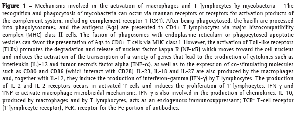 Regarding the innate immune response, neutrophils are the first inflammatory cells to arrive at the bacillus multiplication site, followed by natural killer (NK) cells and macrophages. The NK cells can destroy pathogens directly or by killing the infected monocytes, as well as being able to activate phagocytic cells at the site of the infection.(3) However, it has been shown that mice depleted of NK1.1 cells do not present greater susceptibility to mycobacterial infection.(12) The recognition and phagocytosis of bacteria by innate immunity cells (neutrophils, macrophages, and dendritic cells) occur via recognition receptors, such as the mannose receptor, receptors for the Fc portion of antibodies (FcRs), and receptors for activation products of the complement system, such as C3b and C4b (CR1), among others.(3) The activation of standard recognition receptors, such as Toll-like receptors (TLRs), leads to an important connection between innate and acquired immune response. The expression of co-stimulating molecules such as CD80 and CD86, on the surface of macrophages and dendritic cells, is induced after TLRs recognize specific molecules of the pathogens, such as lipoarabinomannans, lipoproteins and other lipid derivatives of M. tuberculosis.(13,14) The activation of CD4+ lymphocytes involves the recognition of the peptide bound to MHC class II and the interaction between co-stimulating molecules, such as the CD80/CD86-CD28 interaction. In addition, cytokines produced by antigen-presenting cells, such as interleukin (IL)-12, and cytokines produced by activated T lymphocytes, such as IL-2, are involved in the activation and proliferation of T lymphocytes. Consequently, M. tuberculosis-specific antigens interact with TLRs and other receptors present on the surface of macrophages and dendritic cells, thereby inducing a predominantly pro-inflammatory cellular immune response (Figure 1).