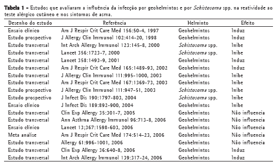 Alguns estudos, entretanto, demonstraram que pacientes infectados com geohelmintos apresentavam maior freqüência de reatividade ao teste alérgico cutâneo.(28,29) Além disto, um ensaio clínico com pacientes moradores de favelas demonstrou que o tratamento com albendazol reduziu os sintomas de asma,(30) sugerindo que a infecção por geohelmintos poderia piorar a inflamação alérgica das vias respiratórias destes pacientes. Adicionalmente, um estudo transversal(31) e um ensaio clínico(32) publicados recentemente sugerem que as infecções por geohelmintos não influenciam na reatividade ao teste alérgico cutâneo ou nos sintomas de asma. (Tabela 1)