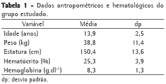 Foram estudados 50 pacientes no período de setembro de 2004 a maio de 2005, dos quais 25 (50%) pertenciam ao sexo masculino. Os dados antropométricos e hematológicos podem ser encontrados na Tabela 1. Quanto à distribuição étnica, encontramos 16% brancos, 34% negros e 50% pardos.