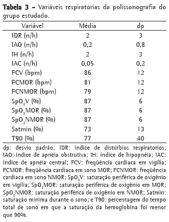 Observamos que a média do índice de distúrbios respiratórios de 2 ± 3 eventos/h estava aumentada para a idade, sendo que um paciente apresentou 10 eventos/h. A média do índice de apnéia obstrutiva também estava aumentada, 0,2 ± 0,8 eventos/h, sendo que um paciente apresentou 5 eventos/h. Observou-se que 63% dos pacientes tiveram o ronco registrado na polissonografia. A saturação periférica da hemoglobina em vigília variou de 71 a 97% (média de 87 ± 6%), sendo que a saturação mínima durante o sono variou de 51 a 96% (média de 73 ± 13%).