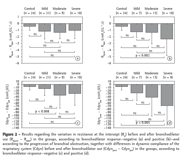 The forced oscillation technique (FOT) allows the estimation of parameters that translate the resistive and relative properties of the respiratory system. The FOT requires only passive cooperation, is performed during spontaneous breathing and provides new parameters for analysis.(2-4) Although the potential for use of the FOT in the study of the pathophysiology of bronchodilator response in asthma patients is high, relatively few studies have investigated that potential.(5-9) Such studies have demonstrated that the parameters obtained using the FOT allow adequate identification of reduced muscle tone and, consequently, of reduced airway resistance as a result of bronchodilator testing in adult patients with asthma. Our study group has recently reported results regarding the analysis of bronchodilator response using the FOT in asthma patients presenting such a response.(10) The results presented in that studies raised the following question: Are bronchodilator-mediated changes in the resistive and elastic properties of the respiratory system dependent on the basal level of bronchial obstruction? This is a question of great interest that, to the best of our knowledge, has yet to be addressed.