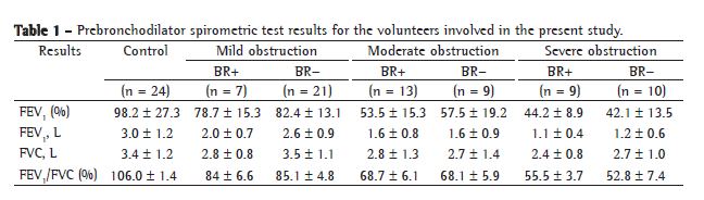 The biometric characteristics (age, weight, height and gender, respectively) were similar in all groups: control (41.9 ± 16.3 years; 63.4 ± 11.9 kg; 160.1 ± 10.3 cm; 6 males); mild obstruction (41.2 ± 17.2 years; 67.9 ± 14.0 kg; 161.2 ± 11.0 cm; 7 males); moderate obstruction (47.6 ± 17.5 years; 65.2 ± 10.6 kg; 159.0 ± 12.2 cm; 10 males); and severe obstruction (51.5 ± 18.49 years; 69.5 ± 14.4 kg; 161.2 ± 8.2 cm; 9 males).
