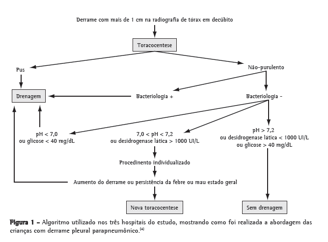 MétodosEstudo retrospectivo de 99 crianças (3 meses a 12 anos), 60 (60%) do sexo masculino e idade média de 2,6 anos, portadoras de DPPC na fase fibrinopurulenta, que foram submetidas à toracoscopia no Hospital de Clínicas de Porto Alegre (HCPA) e no Hospital Moinhos de Vento (HMV) em Porto Alegre (RS), assim como no Hospital Geral de Caxias do Sul (HGCS) em Caxias do Sul (RS), no período entre novembro de 1995 e julho de 2005. O manejo desses pacientes foi realizado usando-se o mesmo algoritmo de tratamento (Figuras 1 e 2).(4) Em cada hospital estudado, os seguintes dados foram coletados dos prontuários: idade; sexo; realização de toracocentese; uso de antibiótico prévio à cirurgia; aspecto macroscópico, bioquímica, bacterioscopia e cultura do líquido pleural; tempo do início do quadro clínico até a realização da toracoscopia; tempo de drenagem torácica; tempo de internação; eficácia da toracoscopia; e necessidade de outro procedimento cirúrgico.
