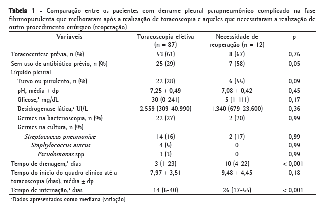 Alguns pacientes deste estudo foram submetidos à drenagem torácica tubular fechada antes da realização da toracoscopia. Como não apresentaram melhora com a drenagem tubular, com persistência do quadro infeccioso e o surgimento de líquido pleural septado, eles foram posteriormente submetidos à toracoscopia. Essas crianças foram encaminhadas de outros hospitais ou foram submetidas à drenagem torácica inicialmente em nosso serviço devido a DPPC na fase aguda. Uma avaliação inicial poderia presumir que a drenagem tubular prévia, devido ao maior período de evolução do processo infeccioso, seria um fator desfavorável à resolução do DPPC com a toracoscopia; entretanto, isso não foi observado, já que somente um pequeno número de crianças deste grupo (16,1%) não apresentou melhora do quadro clínico com a primeira toracoscopia, havendo a necessidade de outro procedimento cirúrgico posteriormente.