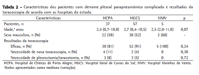 Das 12 crianças que necessitaram reintervenção cirúrgica, 5 foram operadas no HGCS: 2 foram submetidas à nova toracoscopia, e 3 foram submetidas à pleurostomia/toracotomia. As outras 7 crianças foram tratadas no HCPA: 4 foram submetidas à nova toracoscopia, e 3 foram submetidas à pleurostomia/toracotomia; não houve a necessidade de reintervenção cirúrgica no HMV. As indicações de reintervenção foram febre e persistência de líquido residual intrapleural, com ou sem septações.