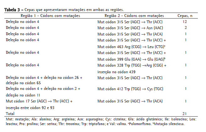 Em outras 44 cepas, houve mutações de serina (AGC) para treonina (ACC) associadas a mutações na região intergênica mabA-inhA e apenas 3 mutações no gene inhA. Portanto, ocorreram 288 mutações no códon 315 (90,8%), e 26 cepas resistentes à INH (8,2%) não mostraram mutações nos dois genes.(29)