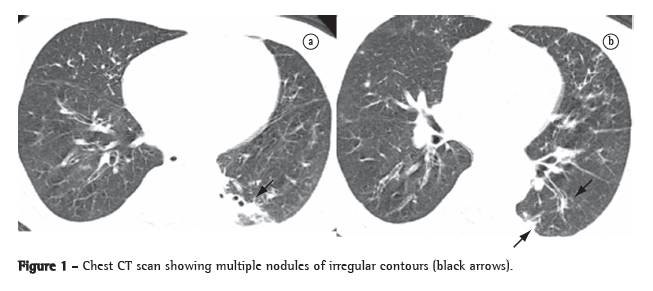 Pleural effusion, septal thickening and areas of ground-glass attenuation (as were found in the present case series) accompanied by nodules and areas of consolidation have also been described in the literature, at varying frequencies of occurrence.(2,3,8,13-19) Table 2 summarizes the frequency of our findings in relation to that of other studies.