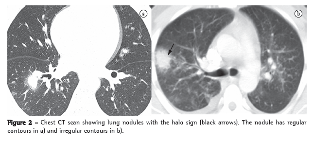 Although the halo sign is the most suggestive tomographic finding for the diagnosis of IPA, its sensitivity and specificity are controversial issues in the literature. The halo sign has also been reported in association with other fungal infections (mucormycosis and actinomycosis), bacterial infections (Pseudomonas sp. and Legionella sp.) and viral infections (herpes simplex and cytomegalovirus), as well as with certain noninfectious processes such as Wegener's granulomatosis, Kaposi's sarcoma, bronchioloalveolar carcinoma and metastasis.(2,8,19,20) Particularly in immunocompromised patients, the halo sign has been linked to IPA, Kaposi's sarcoma and lymphoproliferative disorders.(20) However, most of the studies of IPA that address the tomographic finding of the halo sign are retrospective and include individuals in different phases of the disease, which results in great variation in the evaluation of the sensitivity and specificity of such sign.