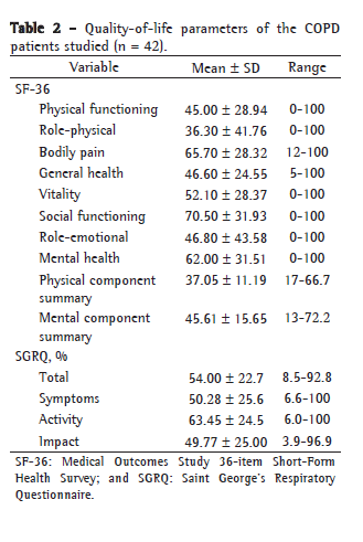 The multivariate analysis of the present study revealed that only FEV1 correlated with the SGRQ total score and with the SGRQ activity domain score (r = −0.32; p = 0.04 and r = −0.34; p = 0.03, respectively). The impact of variables such as FEV1 on quality of life, as assessed using the SGRQ, has not been demonstrated in other studies that used multivariate analysis.(6,8)