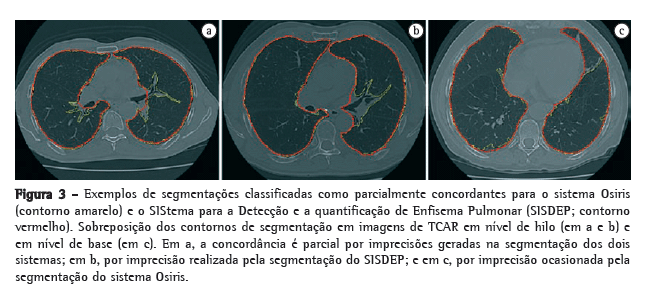 As segmentações feitas pelos dois sistemas foram comparadas visualmente por dois observadores (um pneumologista e um radiologista) independentes e foram classificadas como: 1. discordantes, em caso de erros grosseiros, como ausência de segmentação de mais de um terço dos pulmões, ou mesmo de um pulmão inteiro, ou ainda a inclusão de áreas da parede torácica ou de estruturas mediastinais, como coração e grandes vasos; 2. parcialmente concordantes, quando os contornos se mostraram superponíveis em mais de 80% do traçado; e 3. concordantes, quando os contornos foram superponíveis ou com mínimas diferenças pontuais em toda sua extensão.