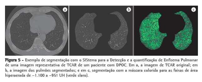 Recentemente, desenvolvemos um sistema de visão computacional, o qual denominamos SIStema para a Detecção e a quantificação de Enfisema Pulmonar (SISDEP). O SISDEP incorpora ferramentas capazes de segmentar com precisão o parênquima pulmonar a partir de imagens de TCAR, tornando possível a extração automática de dados quantitativos da aeração pulmonar e possibilitando estimar o grau de enfisema nos cortes tomográficos.(10,11)