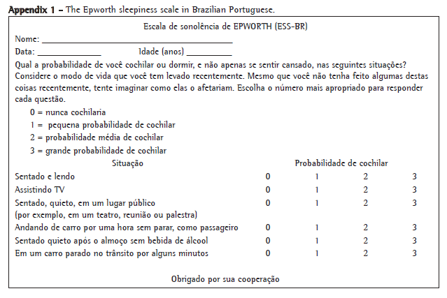 Measures of sleepiness over time include the sleep-wake activity inventory, the index of daytime sleepiness of the survey screen for sleep apnea, the Rotterdam daytime sleepiness scale and the Epworth sleepiness scale (ESS). The ESS was devised based on observations regarding the nature and occurrence of daytime sleepiness.(19) It is a self-report questionnaire that evaluates the probability of falling asleep in eight situations involving daily activities, some known to be highly soporific.(19,20) The global score ranges from 0 to 24, scores higher than 10 suggesting a diagnosis of EDS.(20) The ESS has been translated to and validated for use in several other languages, being widely used because it is simple, easy to understand and rapidly completed. The aim of the present study was to translate the ESS into Portuguese and validate it for use in Brazil.