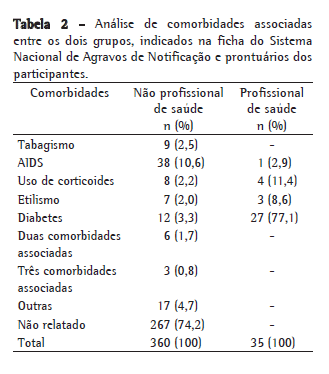 Dentre os 35 profissionais de saúde pesquisados, foram relatados comorbidades associadas em 8 (22,8%). Desses, 1 (12,5%) era tabagista, 4 (50,0%) foram diagnosticados com AIDS, e 3 (37,5%) foram diagnosticados com outras doenças (linfoma, neoplasia e granulomatose de Wegener). Para os demais indivíduos do grupo PS, essa informação não estava disponível.