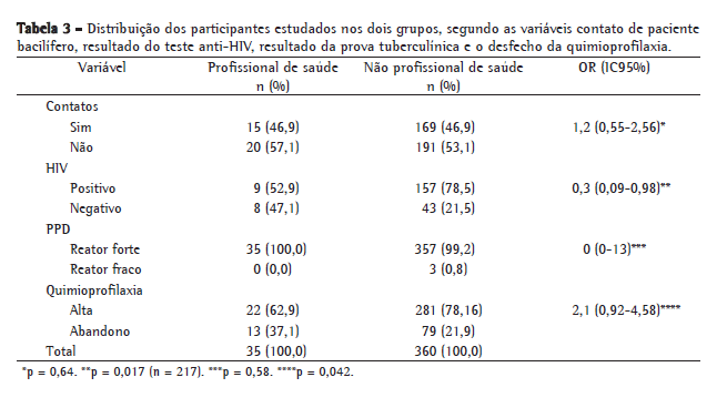 Vale ressaltar que, no grupo PS, 57% dos participantes não eram contatos domiciliares de pacientes com TB; porém, pode-se presumir que muitos profissionais se infectaram com o bacilo através do exercício de sua profissão, como demonstrado em outros estudos que mostraram um provável adoecimento por primoinfecção.(5,10,13)