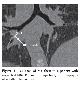 Serious respiratory sequelae, such as recurrent pulmonary infections, bronchiectasis and destruction of the previously healthy lung parenchyma, can result from FBA. Therefore, early diagnosis and intervention are fundamental for better management of this condition.(6) Definite treatment is conducted by bronchoscopy, an invasive procedure, which, although simple, is not free of complications and risks. Virtual bronchoscopy (VB) is a relatively new, non-invasive, procedure that provides a three-dimensional view of the internal walls of the tracheobronchial tree through the reconstruction of axial images.