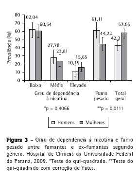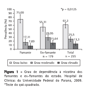 Dos 629 pacientes no estudo, 76 (12,1%) eram fumantes, 179 (28,5%) eram ex-fumantes e 374 (59,5%) eram não fumantes. Dos 76 fumantes, 32 (42,1%) eram homens e 44 (57,9%) eram mulheres (Tabela 1). Entre os fumantes, 89,5% relataram vontade de parar de fumar, e 84,2% já tinham tentado parar pelo menos uma vez. Entre os ex-fumantes, os motivos para a cessação do tabagismo mais referidos foram os relacionados à manutenção ou recuperação da saúde e à gestação (56,4%), sendo que 95,5% relataram ter parado de fumar por força de vontade. O índice de cessação do tabagismo foi de 0,70 (IC95%: 0,64-0,76). A média de idade entre os fumantes foi de 47,1 ± 12,5 anos (variação: 18-76 anos) e, entre os ex-fumantes, essa foi de 52,3 ± 14,6 (variação: 18-84 anos; p = 0,0070). A média de idade no início do tabagismo entre os fumantes e os ex-fumantes foi de, respectivamente, 16,3 ± 5,9 anos (variação: 6-46 anos) e 16,1 ± 4,8 anos (variação: 5-35 anos; p = 0,8379). A carga tabágica entre os fumantes e entre os ex-fumantes apresentou mediana de, respectivamente, 11,2 maços-ano (limites: 0,05-245,0) e 20,0 maços-ano (limites: 0,05-320,0; p = 0,0292). O grau de dependência, aferido pelo FTND, demonstrou, entre os fumantes, dependência leve em 57 entrevistados (75,0%), dependência média em 13 (17,1%) e dependência elevada em 6 (7,9%); entre os ex-fumantes, o grau de dependência leve, média e elevada ocorreu em 99 (55,3%), em 52 (29,1%), e em 28 (15,6%), respectivamente (p = 0,0125; Figura 1).