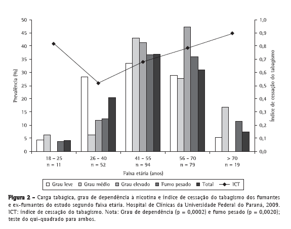 A carga tabágica foi medida em maço-ano, que representa o produto do número de maços utilizados em um dia pelo número de anos que o paciente fumou. Para avaliar o grau de dependência, foi utilizada a adaptação ao português do Fagerström Test for Nicotine Dependence (FTND) de Carmo e Pueyo.(7) Considerou-se fumante pesado quem declarou fumar mais de 20 cigarros por dia.