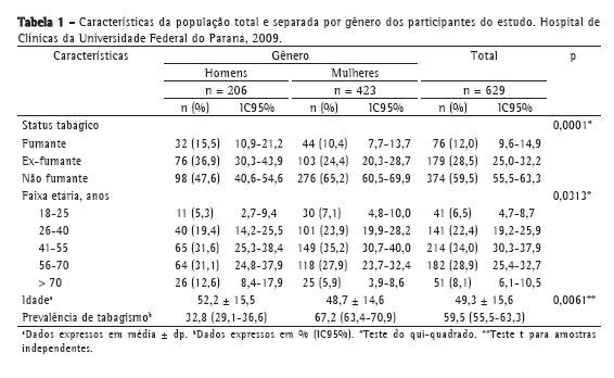 A prevalência de tabagismo observada neste estudo de população específica - pacientes de um hospital universitário - é significativamente menor do que a observada tanto em um estudo com população de características semelhantes (Hospital das Clínicas de Botucatu), quanto em estudos de base populacional, o que impede que se atribua exclusivamente às diferenças amostrais a diferença observada na prevalência.(10,11)