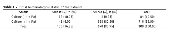 ResultsThe mean age of the patients was 39 ± 14 years (range, 16-75 years). The mean symptom duration was 113 ± 196 days (median, 120 days). The number of patients who reported close contact with an active tuberculosis patient was 193 (24.1%). The most common concomitant diseases were diabetes, reported by 81 patients (10.1%), and COPD, reported by 80 patients (10.0%). The initial mean ESR was 58 ± 37 mm/h. Initial sputum smears for AFB and cultures for M. tuberculosis were positive in 83.8% and in 89.5% of the patients, respectively (Table 1).
