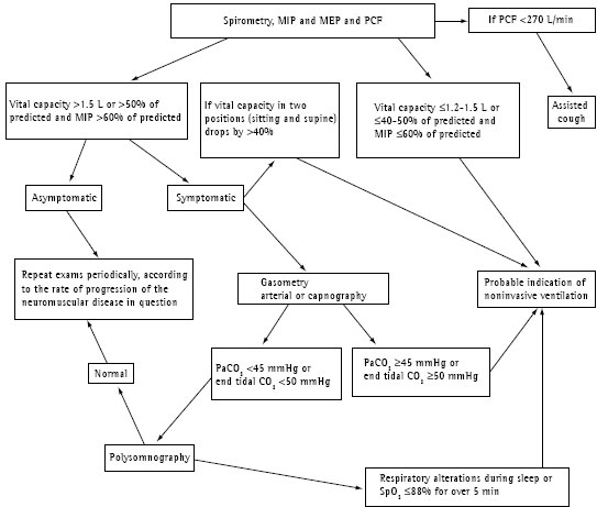 Therefore, in each respiratory evaluation, it is recommended that the following be performed: pulse oximetry; measurements of vital capacity and forced expiratory volume in one second in two positions (sitting and in the dorsal decubitus position), in order to make the test more sensitive; measurement of maximal inspiratory and maximal expiratory pressures; and the determination of peak cough flow.
