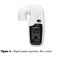 The measurement of peak cough flow can be made with the aid of a peak flow meter (Figure 4). Peak cough flow is directly correlated with the capacity to clear secretions from the respiratory system,(20) and values lower than 160 L/min are associated with inadequate clearance of the tracheobronchial tree.(21,22) However, values greater than, but proximal to, 160 L/min do not necessarily guarantee adequate protection of the airways, since muscle force tends to worsen during episodes of infection.(23) Therefore, a peak cough flow cut-off value of 270 L/min has been used to identify patients who would benefit from assisted cough techniques.(24)