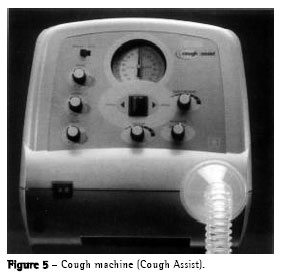 For patients presenting little or no force to cough, it is formally recommended to use a device capable of producing inflation with positive pressure and aspiration with negative pressure immediately after lung expansion. This device is known as IN-Exsufflator or Cough Assist (Figure 5). The comparison between the peak cough flows produced with these machines and those produced by maximum inflation and assisted cough reveals the superiority of the mechanical reproduction of cough. Indeed, the use of one of these machines significantly facilitates the care of patients with neuromuscular disease, even in the early stages of respiratory muscle strength impairment.