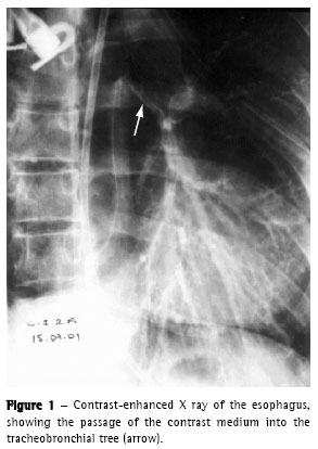 Acquired TEF can have various etiologies, malignant neoplasms of the esophagus being the most common.(7) Among the benign TEFs, ischemia and posterior necrosis of the tracheal and esophageal membrane, due to the tracheal and gastric tube cuffs seen in individuals on prolonged mechanical ventilation, are the most common etiologies.(6,9) Less common etiologies include foreign bodies, instrumental esophageal dilation, esophageal diverticulum perforation, mediastinal abscesses, thoracic trauma (open or closed) and chemical burns in the esophagus.(6,7,9)