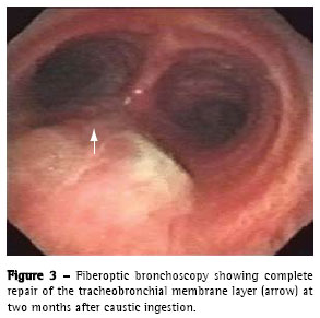 The patient presented favorable evolution, being discharged 17 days after admission. Two months after discharge, he presented to the emergency room with progressive dyspnea for 10 days, together with intense intercostal wheezing and retractions. The fiberoptic bronchoscopy revealed supraglottic stenosis (annular neoformation of the fibrotic tissue), and tracheostomy was indicated. He was monitored as an outpatient, and, six months after the caustic ingestion, a palatopharyngoplasty was performed, and the tracheostomy was deactivated.