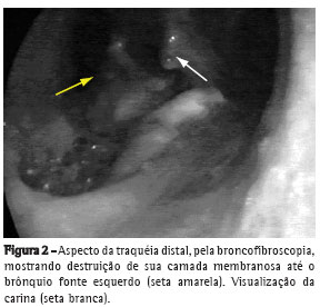 observou-se área de destruição da traquéia distal, carina e brônquio esquerdo de aproximadamente 3 x 1,5 cm (Figuras 2 e 3), exposição de