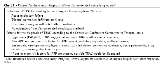 According to the most recent Consensus Conference on TRALI, the diagnosis of that reaction is made in patients with the occurrence of acute respiratory distress during or within 6 h after transfusion without any sign of circulatory overload, evidence of bilateral pulmonary edema and the absence of additional risk factors for acute respiratory failure. The criterion for the clinical diagnosis of TRALI is summarized in Chart 1. The differential diagnosis of patients with acute respiratory failure unrelated to TRALI includes transfusion-related circulatory overload, cardiogenic edema, allergic and anaphylactic transfusion reactions as well as the transfusion of bacteria-contaminated blood components.(2)