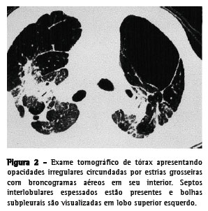 Paciente do sexo masculino, 27 anos, fumante esporádico há cinco anos, há seis anos vem apresentando dispnéia progressiva a esforço moderado, tosse seca e emagrecimento de 20 kg. Há quatro anos vem sendo tratado com corticosteróide sistêmico. Apresentou quadros repetidos de infecção respiratória e três episódios de pneumotórax espontâneo nos dois últimos anos. À admissão apresentava linfonodomegalia em cadeia cervical anterior bilateral de aspecto reacional e hepatomegalia. A ausculta evidenciou hiperfonese de P2, murmúrio vesicular diminuído difusamente e raros sibilos. O hemograma demonstrou poliglobulia (hemoglobina = 18,2 g/dL e volume globular = 54%). As provas de atividade inflamatória e função hepática foram normais. As pesquisas de fungos e de bacilos álcool-acido resistentes (BAAR) no escarro e lavado broncoalveolar foram negativas. O teste de Kveim-Silzbach foi negativo e a dosagem de enzima conversora de angiotensina foi de 51,7 U/L (35-90 U/L). A tomografia computadorizada de tórax demonstrou opacidades irregulares circundadas por estrias grosseiras, septos interlobulares espessados, bolhas subpleurais em lobo superior esquerdo e linfonodomegalia hilar bilateral, já evidenciados à radiografia (Figuras 1 e 2). A espirometria revelou distúrbio ventilatório obstrutivo grave (capacidade vital forçada = 51%, volume expiratório forçado no primeiro segundo = 26% e volume expiratório forçado no primeiro segundo/capacidade vital forçada = 52%) associado a aprisionamento de ar (volume residual = 186% e volume residual/capacidade pulmonar total = 217%) e distúrbio difusional leve (DCO = 69%). A gasometria arterial evidenciou hipoxemia grave (pressão parcial arterial de oxigênio = 45,5 mmHg). Foi realizada ecografia abdominal, que demonstrou fígado homogêneo, mas com sinais de aumento da ecogenicidade periportal. Foi realizada biópsia hepática, que evidenciou agregados multifocais de células epitelióides, ausência de necrose e não foram visualizados BAAR, compatíveis com hepatite granulomatosa multifocal. A biópsia de linfonodo de ângulo traqueobrônquico, através de mediastinoscopia, revelou presença de material hialino, positivo para material amilóide pela coloração de cristal-violeta. Para complementar a investigação, o paciente foi submetido à biópsia pulmonar a céu aberto, cuja histologia demonstrou alargamento de septos alveolares por fibrose, infiltrado inflamatório linfohistiocitário e esparsas estruturas granulomatosas com linfócitos, histiócitos epitelióides e ausência de necrose caseosa, compatíveis com sarcoidose (Figura 3).