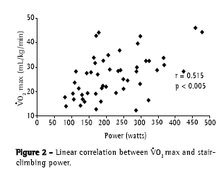 where W is work, m is patient weight in kilograms, g is the acceleration due to gravity (9.8 m/s2), and h is the height of the staircase in meters (12.16 m). We obtained the values for the variable 'power', expressed in watts (w), by dividing the work performed by the stair-climbing time.The V O2 max was measured using a Quinton stress test system (Q4500, Quinton Instruments, Seattle, WA, USA) coupled to a treadmill, in a climate-controlled environment.(19,20) Heart rate and respiratory frequency were monitored throughout the test, as were arterial blood pressure, oxygen saturation, and electrocardiogram with 12 leads. Although all of the variables of the spirometry during exercise test were measured, the only one used was V O2 max, expressed in mL/kg/min. We used the Balke protocol,(21) which is an incremental protocol and is indicated for individuals with comorbidities. The test would be interrupted if there were the following developments: a drop in systolic arterial pressure greater than 10 mmHg in relation to rest; angina; symptoms related to the central nervous system (ataxia, dizziness, or lightheadedness); signs of low perfusion (cyanosis or pallor); technical difficulties in monitoring the electrocardiogram or the arterial blood pressure; sustained ventricular tachycardia; ST-segment elevation greater than 2 mm; ST-segment depression greater than 3 mm; patient request; fatigue; dyspnea; wheezing; cramps; claudication; bundle branch block or slowed conduction; increasing chest pain; or hypertensive response.