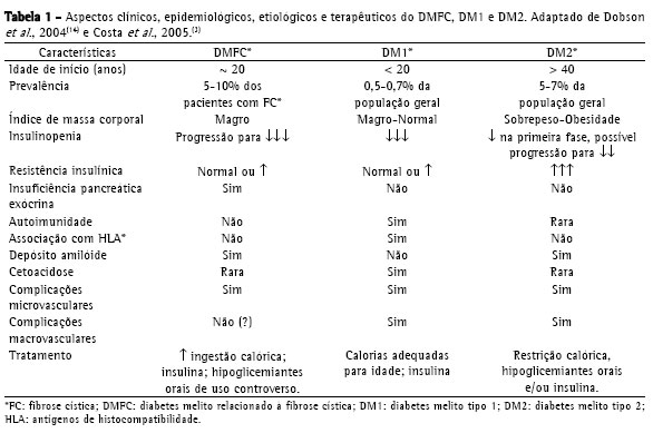 O DMFC apresenta características tanto de DM1 como DM2.(2,3,9) O curso clínico é insidioso. Inicialmente ocorre hiperglicemia pós-prandial que evolui para hiperglicemia em jejum. Outras vezes a hiperglicemia só surge durante períodos de estresse.(3,12) A cetoacidose é infreqüente.(13,36) Além de poliúria, polidipsia e perda ponderal, sintomas clássicos do DM1, manifestações inespecíficas como redução da velocidade de crescimento, atraso no desenvolvimento puberal e declínio não explicado da função pulmonar sugerem o diagnóstico.(3) Algumas vezes, o diabetes pode ser a primeira manifestação da FC.(37) A perda ponderal, queda do índice de massa corpórea, e declínio da função pulmonar têm inicio até 4,5 anos antes do diagnóstico do diabetes.(3,25) Não se deve esperar pelo surgimento dos sintomas clássicos para se pensar no diagnóstico, uma vez que, ao atraso na instituição de medidas terapêuticas, se associa a maior morbidade.(34,38) A Tabela 1 compara o quadro clínico do DMFC com o DM1 e DM2.
