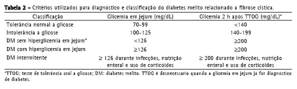 As alterações no metabolismo da glicose no paciente com FC podem ser didaticamente classificadas em: 1) intolerância a glicose, 2) diabetes sem hiperglicemia em jejum, 3) diabetes com hiperglicemia em jejum; e 4) diabetes intermitente, ocorrendo durante períodos de infecção, hospitalizações, uso de nutrição enteral ou parenteral e corticoterapia.(2,3)