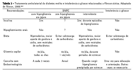 O tratamento do DMFC visa o manejo da hiperglicemia, prevenção da hipoglicemia, otimização do estado nutricional e promoção da adaptação social e emocional.(28) A abordagem deve ser individualizada, com ênfase nos aspectos clínicos e de gravidade de cada caso, contando com equipe multidisciplinar. A educação, conscientização e cooperação dos pais são elementos importantes no estabelecimento de uma relação de mútua confiança, visando à terapêutica precoce e correta.(27) Não existem recomendações específicas quanto ao tratamento do paciente com intolerância à glicose. A Tabela 3 sumariza as principais recomendações terapêuticas.