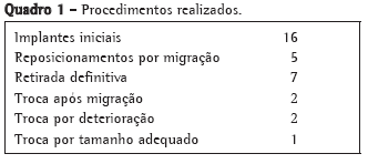 Um total de 33 procedimentos endoscópicos, seja para implante, revisão ou retirada das endopróteses (Quadro 1), foram realizados em centro cirúrgico durante o seguimento médio de 7,45 meses (intervalo de 2 a 18 meses), compreendendo o período do estudo. Em nenhum dos casos houve complicações intra-operatórias ou óbitos relacionados à prótese ou aos procedimentos. Em apenas um dos implantes uma paciente asmática grave teve broncoespasmo e precisou permanecer 12 h em observação em terapia intensiva. Nos demais casos, os pacientes foram encaminhados para a enfermaria após período de observação de cerca de 2 h.