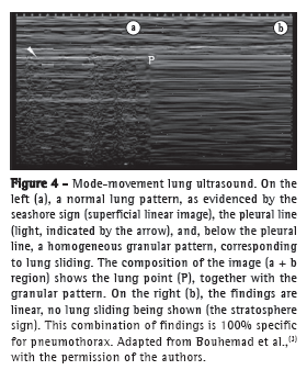 The evaluation of pneumothorax should begin in nondependent lung regions, the interposition of air between the layers of the pleura preventing them from sliding and therefore precluding the presence of B-lines (see Interstitial syndrome below), lung ultrasound showing A-lines only.(2,5) In a study evaluating residual pneumothorax after chest tube removal in postoperative patients, performing lung ultrasound was reported to be faster than taking chest X-rays, lung ultrasound findings having correlated well with chest X-rays findings.(18) In addition, multiple studies have demonstrated the superiority of lung ultrasound over chest X-rays taken in the supine position in ruling out pneumothorax.(19-21) However, the definitive diagnosis of pneumothorax is considered difficult because the absence of lung sliding is not enough to establish it; there is a need to identify an ultrasound sign known as the lung point (intermittent lung sliding point), an experienced examiner being therefore required.(3,4) The lung point consists of a normal lung area in contact with an area with no lung sliding or A-lines. This finding indicates that the lung parenchyma is partially collapsed, being 100% specific for pneumothorax.(1) Likewise, when there is no lung sliding, M-mode ultrasound findings change; below the pleural line, rather than a granular pattern, a linear pattern is seen, a finding that is known as the stratosphere sign (Figure 4).