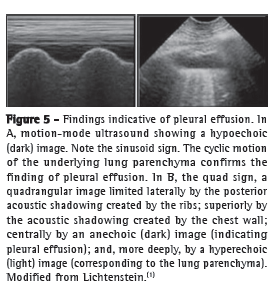 Pleural effusion can also be identified by the quad sign (Figure 5) and differentiated from solid organs by the sinusoid sign (Figure 5), i.e., sinusoidal inspiratory movement, as seen on M-mode ultrasound, with a specificity of 97%.(1)