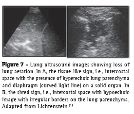 The finding of atelectasis or pulmonary consolidation consists of a loss of aeration, which generates a visible area of parenchyma, similar to the liver texture, with irregular, ill-defined borders.(5) Comparison with the solid abdominal organs (liver and spleen) allows the identification of a clear similarity between the structures (tissue density)-the tissue-like sign-with a specificity of 98.5% for the diagnosis of consolidations (Figure 7A).(1,5) In addition, the presence of irregularities in the margins of the lesion (i.e., in the pleural line itself) constitutes the shred sign (Figure 7B) and has a 90% sensitivity for the diagnosis of parenchymal consolidation.(1) Furthermore, light (hyperechoic) punctiform images can be seen within the consolidation; these images vary according to the respiratory cycle (changing location, size, or shape) and correspond to the finding of air bronchograms.(3)