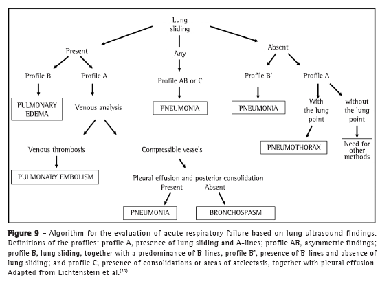 One study combined the abovementioned lung ultrasound findings and proposed an algorithm for the evaluation of patients with acute respiratory failure (Figure 9).(23) In that study, lung ultrasound, performed shortly after the patients had been admitted to the ICU, was found to have an accuracy of 90.5% in relation to the final diagnosis made by the team of attending physicians.(23)